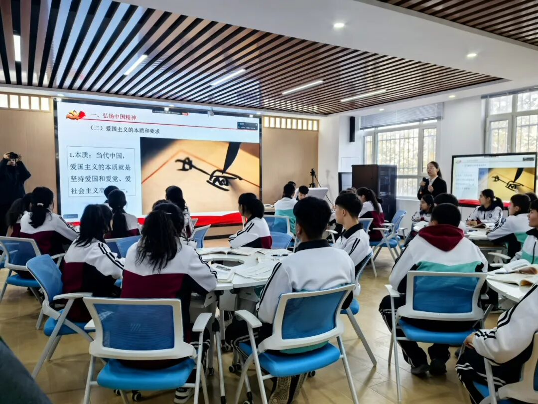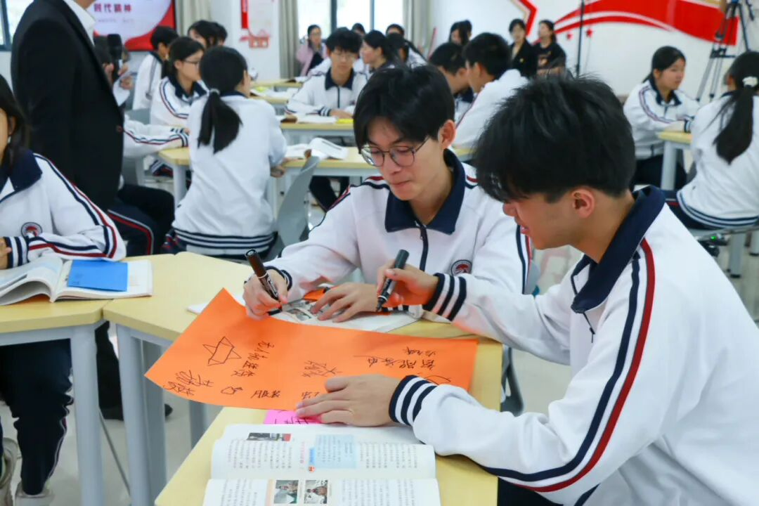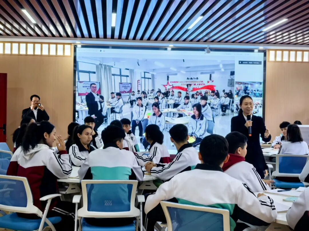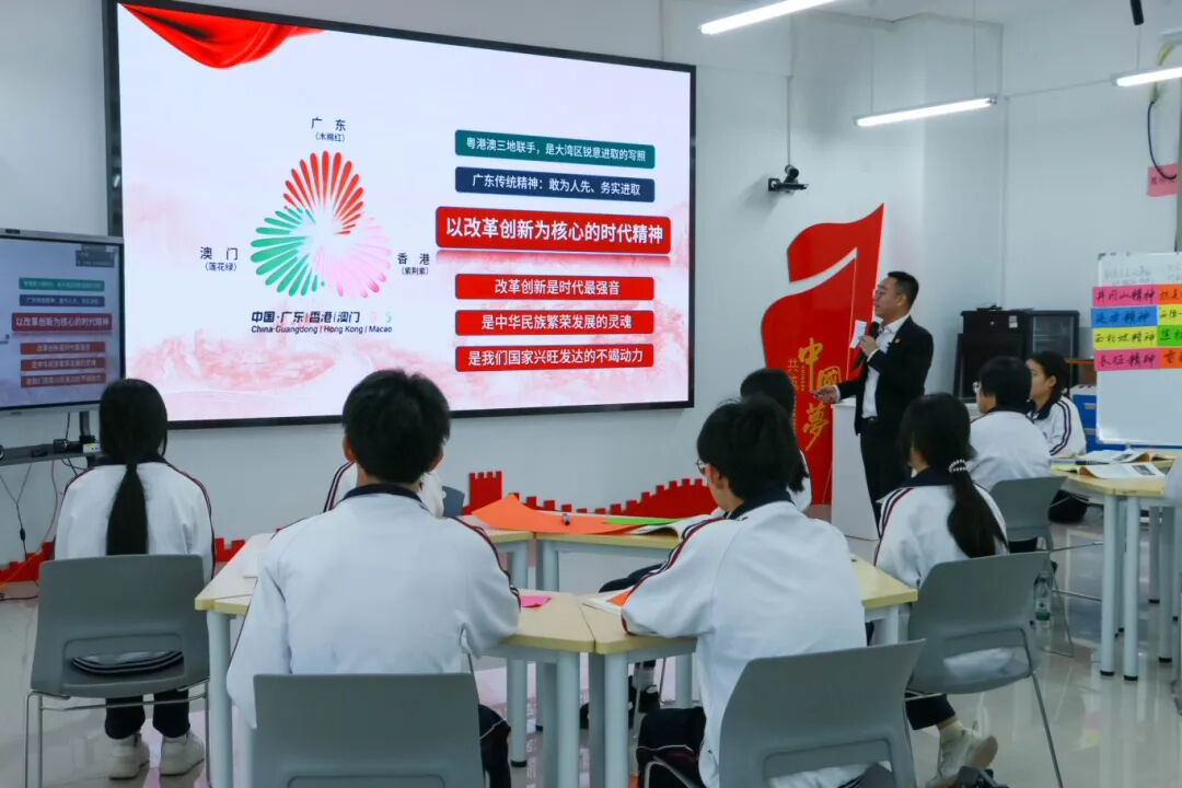 下半场,广州市交通技师学院陈文华老师主讲时代精神。他以第十五届粤港澳大湾区全运会开幕式的科技场景为切入点,深入解读改革创新精神,并通寻脉·写当·说未教学活动,串联古代丝绸之路与新时代粤新协作,引导学生从历史中汲取精神力量。