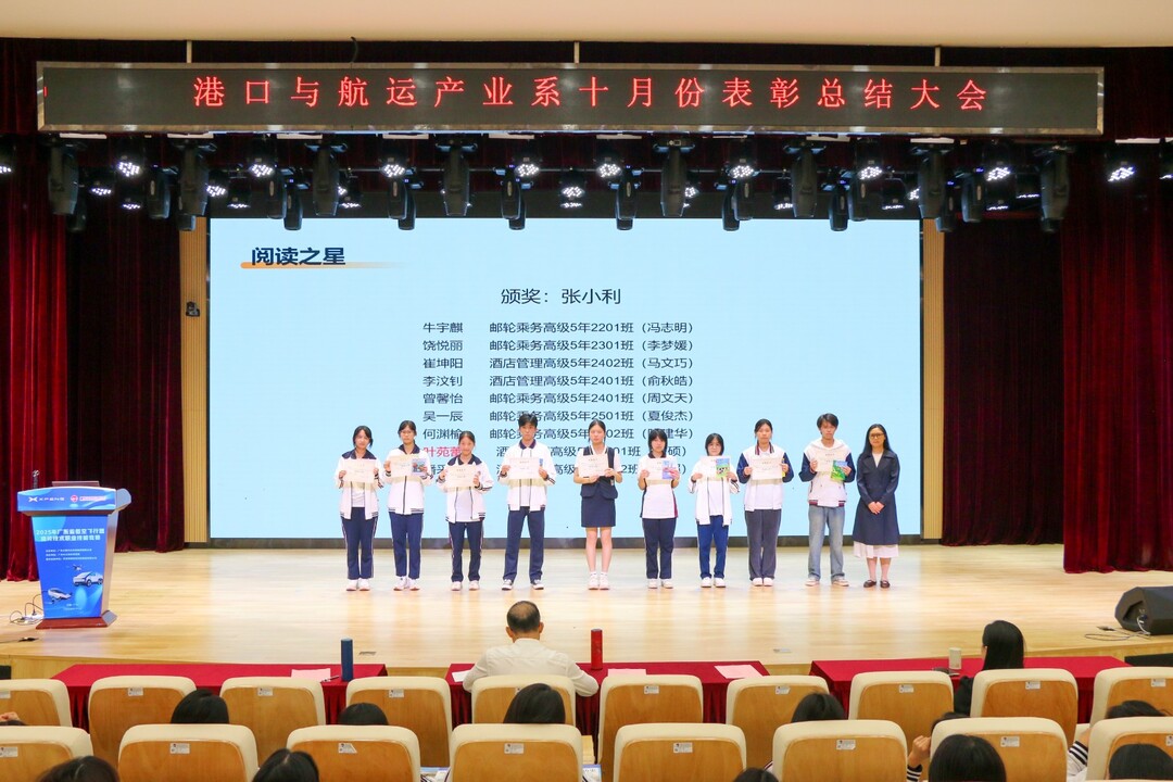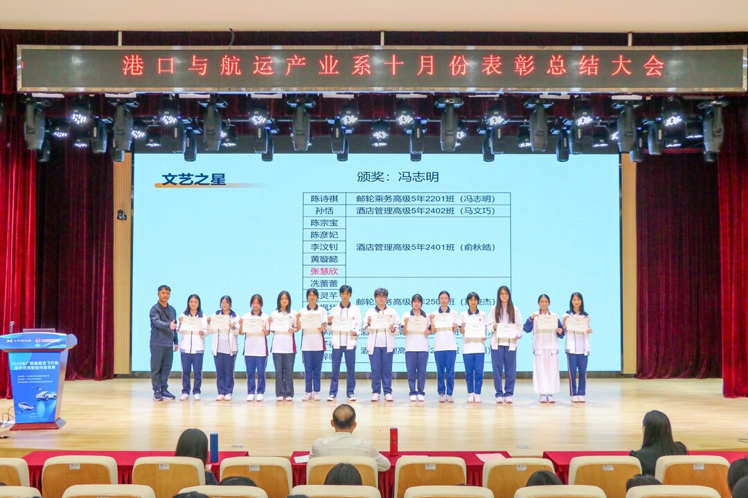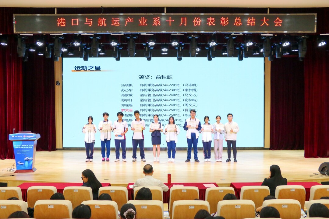 11月3日,广州市交通技师学院港航系十月份表彰总结大会在B2报告厅举行。学院专职纪委书记蒋碧涛、港航系主任曾志海、副主任张小利及系部师生代表齐聚,共证荣耀、凝聚力量。