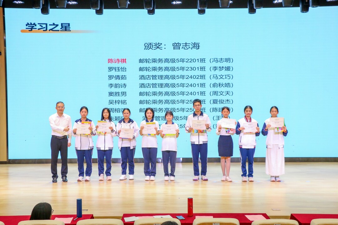 此外,14 名 “文艺之星” 均为上月校园文化艺术节开幕式参演成员,张慧欣娓娓道来舞台表演背后的付出与成长;9 名 “阅读之星”(每班 1 人)是班级月度阅读任务的标杆,各班通过情景剧、手抄报、知识竞赛等多样形式深耕经典阅读,叶苑蕾分享了读书带给自己的认知提升与心灵成长;9 名 “学习之星”(每班 1 人)依据任课老师评价、英语能力及学习通作业表现评选,陈诗祺分享了高效学习的方法与态度;22 名 “军训先进个人” 与 1 个 “军训先进班集体” 则彰显了港航学子的纪律意识与集体凝聚力,冼蕾蕾作为荣誉代表,讲述了军训中的磨砺与蜕变。
