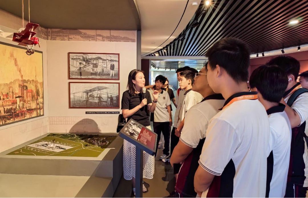 在航空发展历程区,从莱特兄弟展厅内的“机场地勤设备模型展区”成为实践学习的热门区域。提前做了功课的学生主动当起“小讲解员”,结合模型向同学们介绍机场服务飞机的各类车型,包括加油车、飞机牵引车、飞机客梯车等等。通过互动讲解与模型观察,学生们对机场地勤保障与飞机维修工作的联动关系形成了更直观、更深入地认知。“飞行者一号”到我国自主研发的ARJ21客机,讲解员以时间轴为脉络,系统生动讲述了航空工业的百年发展变迁。当驻足于“中国航空第一人”冯如的介绍展板前,学生们深刻领会到其既深耕设计又精研维修的工匠精神,进一步强化了作为飞机维修专业学生的职业认同感与责任意识。