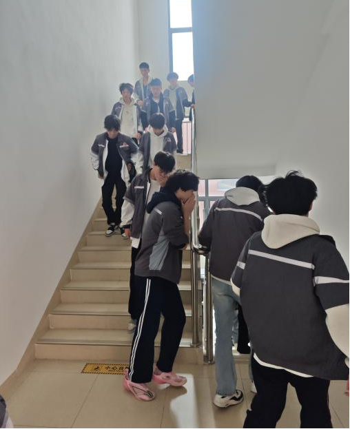 12月30日上午9时35分,演练正式开始。警报响起后,各班级、办公室师生迅速响应,按预定疏散路线有序撤离。各楼层责任教师及时到位,在楼梯口、转角处等位置规范引导、维持秩序;学生严格遵守“弯腰、捂口鼻、靠右行”要求,沿指定路线快速疏散,全程无拥挤、推搡,路线清晰、行动迅速。