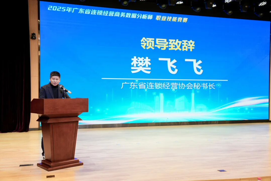 广东省连锁经营协会秘书长樊飞飞致辞,强调了数据分析在连锁行业转型升级中的关键作用,并对竞赛的举办给予高度评价。