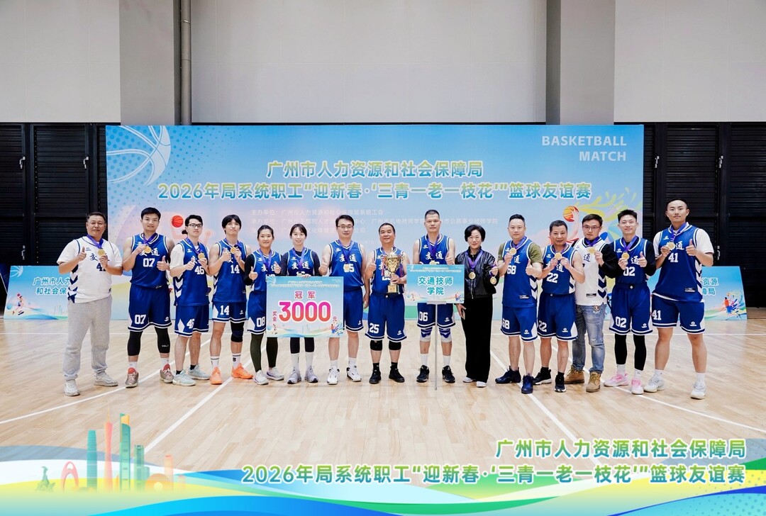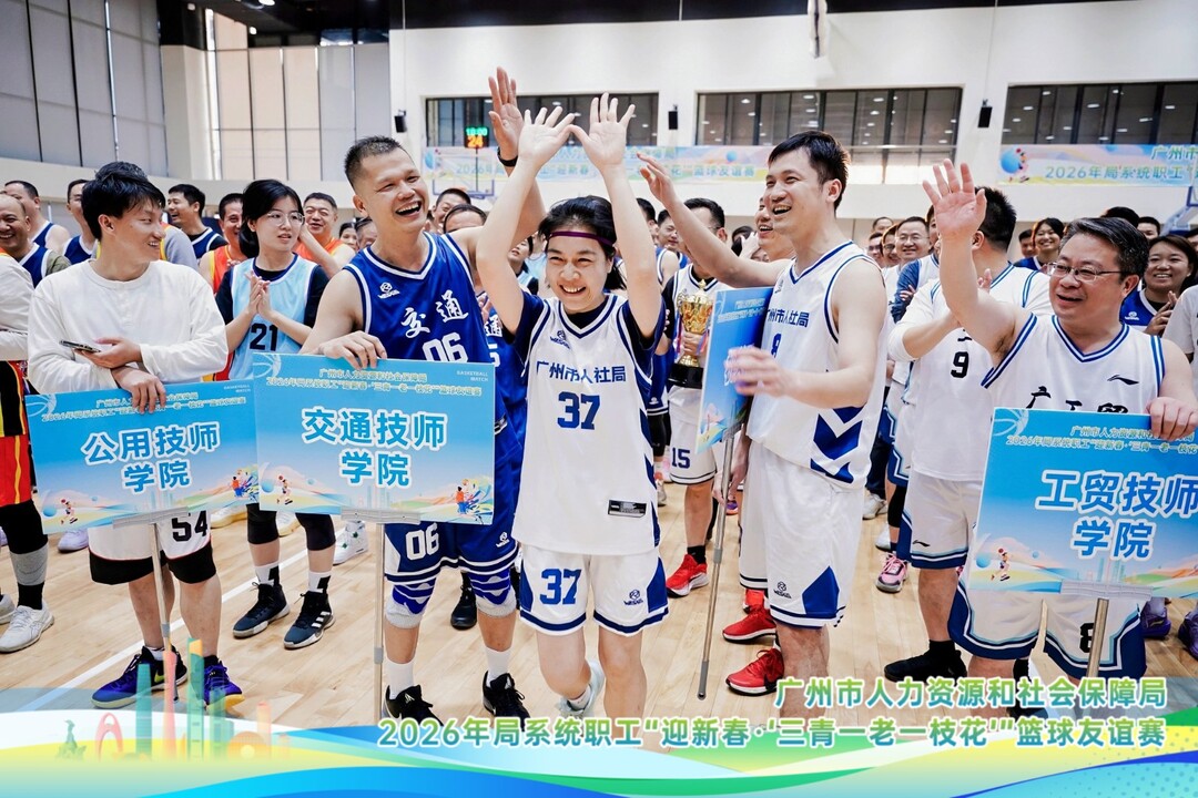 1月12日,由广州市人力资源和社会保障局系统工会主办的2026年“迎新春·‘三青一老一枝花’”篮球友谊赛在广州市第二工人文化宫完满收官。该赛事从2025年12月22日至2026年1月12日举办,共有来自局机关及局属单位的17支代表队、近200名职工运动员参赛。经过多轮激烈角逐,广州市交通技师学院代表队凭借出色的团队协作、顽强的拼搏精神和巧妙的战术安排,一路过关斩将,最终荣获赛事冠军,其中教职工于念以突出表现获得赛事“最佳MVP”,为学院2026年文体赛事新征程赢得“开门红”。