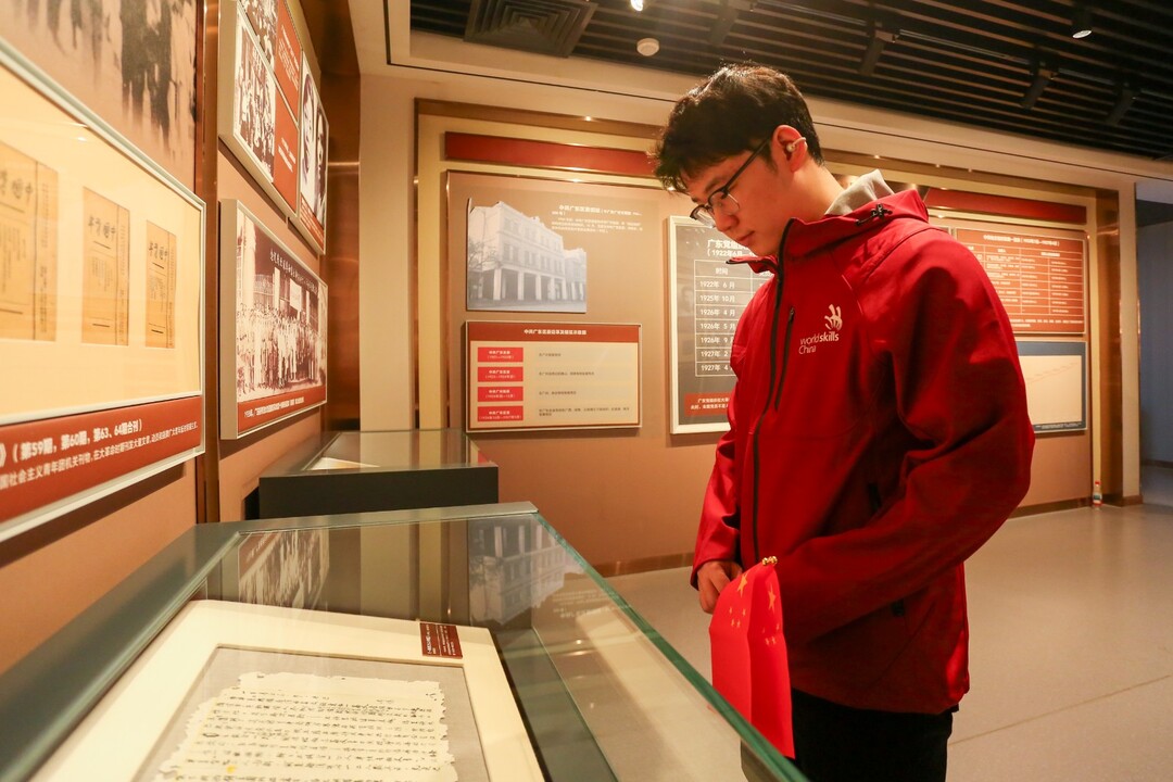 走出实训室,中共三大会址纪念馆成为集训队的“红色研学课堂”。在珍贵史料与复原场景前,革命先辈筚路蓝缕、攻坚克难的奋斗历程,不再只是书本上的单薄文字,而是转化为直击内心的精神力量——这份不畏艰难、坚守信念的红色精神,与冲击世界技能之巅所需的执着、坚韧、敢闯敢拼的品质同频共振。