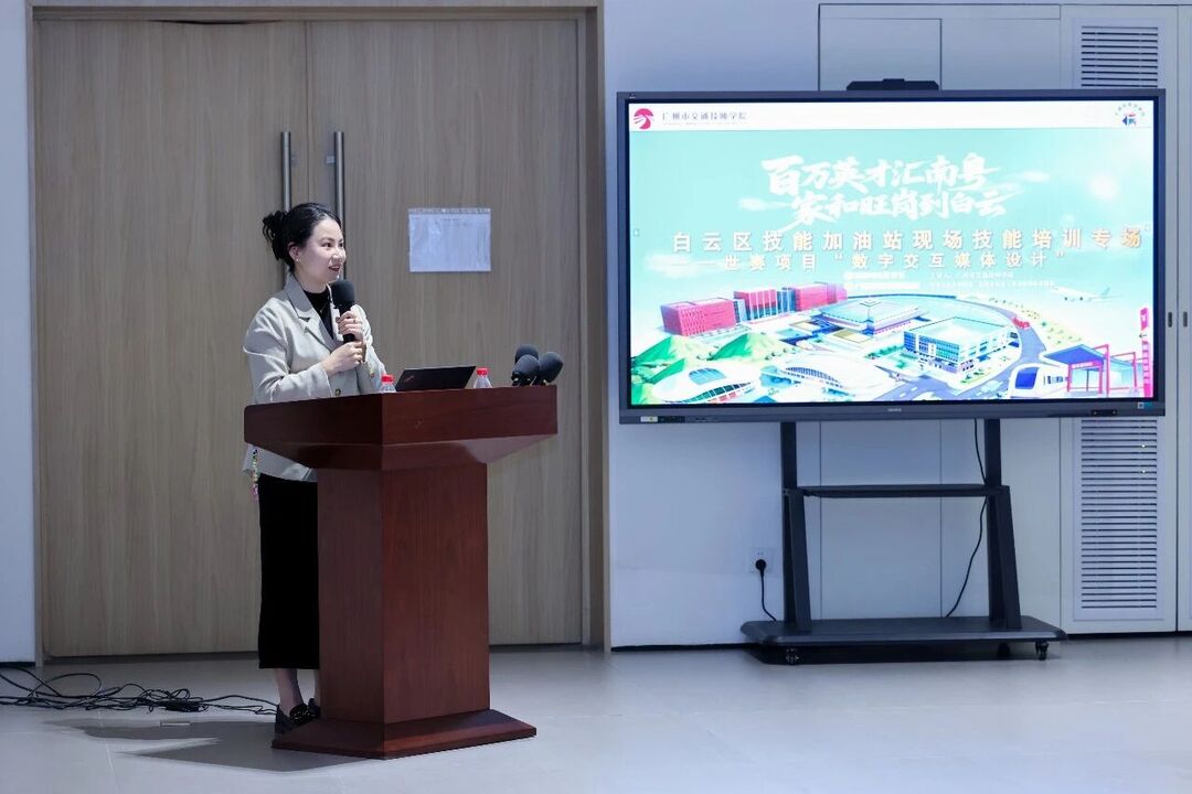 本次培训特邀中华人民共和国第三届职业技能大赛数字交互媒体设计金牌选手指导教练、学院优秀教师黄嬿蓉主讲。培训以第48届世界技能大赛新增赛项为风向标,紧紧围绕“技能接轨、素养提升、职业赋能”三大目标展开,深入解读世赛考核标准与职场需求的关联,拆解国赛金牌案例,展现从创意构思到技术实现的全流程。广州市人力资源和社会保障局一级调研员(市管干部)杨庆华带队到培训现场参观,对学院技能培训工作给予充分肯定。